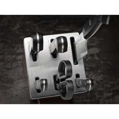 - Хранить в специальной подставке, на магнитных держателях или использовать защитные чехлы. Это сбережет ножи от повреждений и потери остроты, а владельцев – от травм.
