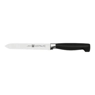 - Универсальный. Характерная особенность – зубчатая кромка. От ножа для хлеба, также имеющего зазубренную кромку, отличается более коротким лезвием. Подходит для красивой нарезки хлеба, колбасы, сыра, томатов и т. д.