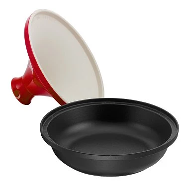 - Керамическая коническая крышка: Коническая форма керамической крышки способствует циркуляции пара внутри посуды. Пар поднимается вверх, конденсируется на стенках крышки и возвращается обратно в блюдо, обеспечивая его непревзойденную сочность и мягкость.