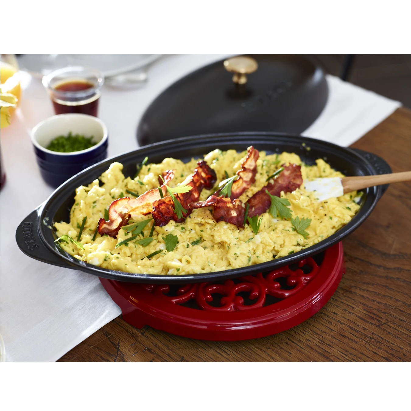 Ассортимент кухонных принадлежностей STAUB включает широкий спектр аксессуаров: от подставок под горячее до специальных инструментов для приготовления и подачи блюд. Прихватки и ручки для посуды делают безопасной работу с горячими поверхностями. Сервировочные ложки и кулинарные кисточки помогают создавать гастрономические шедевры с профессиональной точностью. Каждый предмет становится изюминкой оформления блюд и надежным подспорьем при подаче горячего на стол.