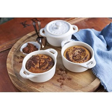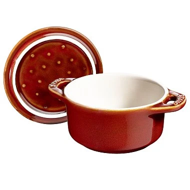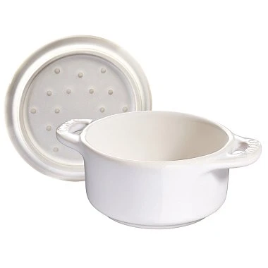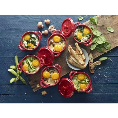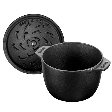 - Уникальная конструкция крышки: Кокоты STAUB оснащены крышками со специальными шипами на внутренней стороне, которые способствуют равномерному распределению конденсата, создавая эффект дождя. Это помогает сохранять влагу и аромат блюд на протяжении всего процесса приготовления.