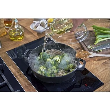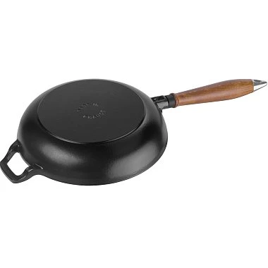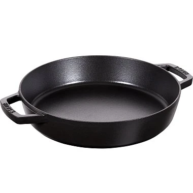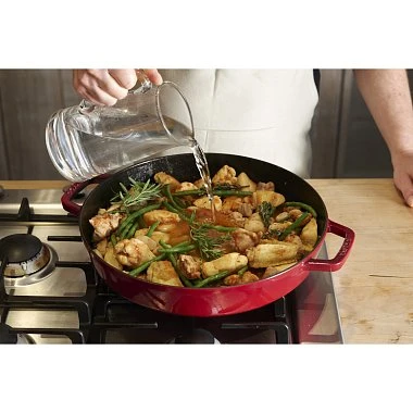 Преимущества кухонной посуды STAUB- Эмалированный чугун: Посуда STAUB изготавливается из прочного чугуна с эмалированным покрытием, что обеспечивает отличную теплоемкость и равномерное распределение тепла. Это позволяет достичь идеальной обжарки без пригорания и сохранить сочность продуктов.